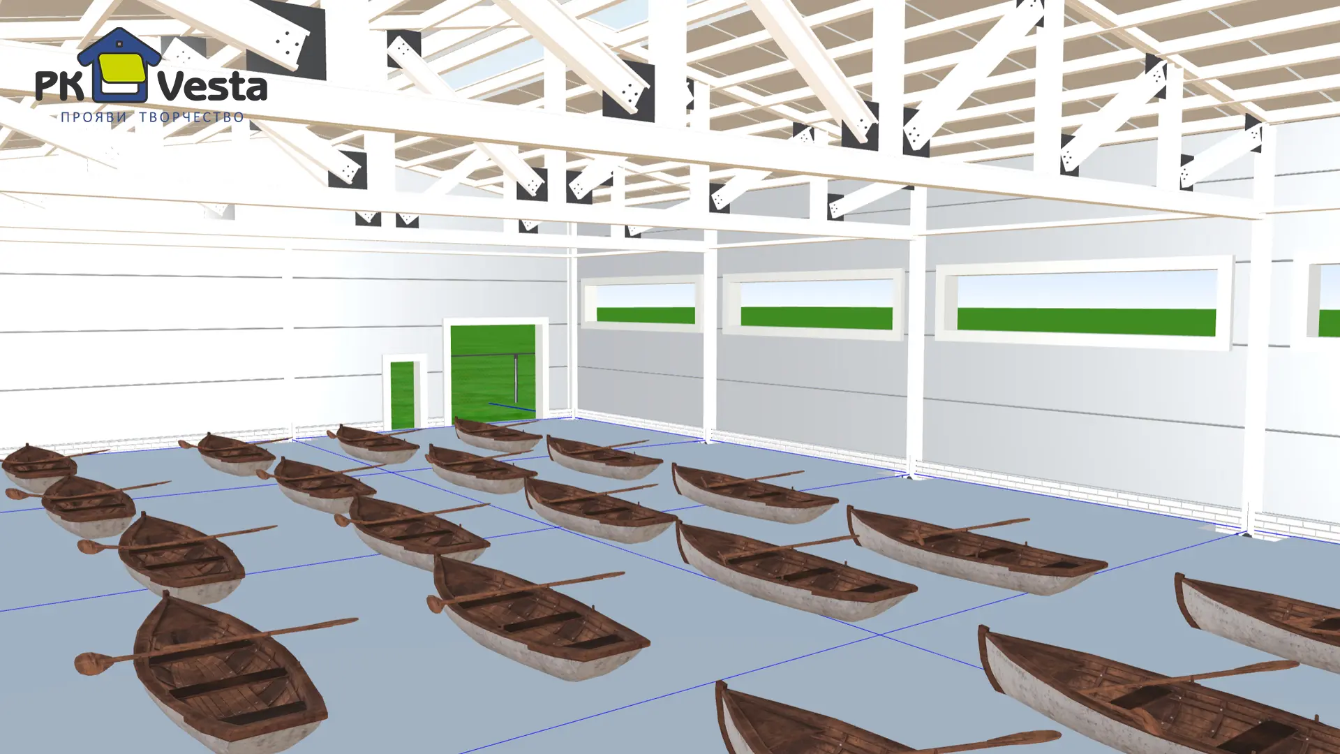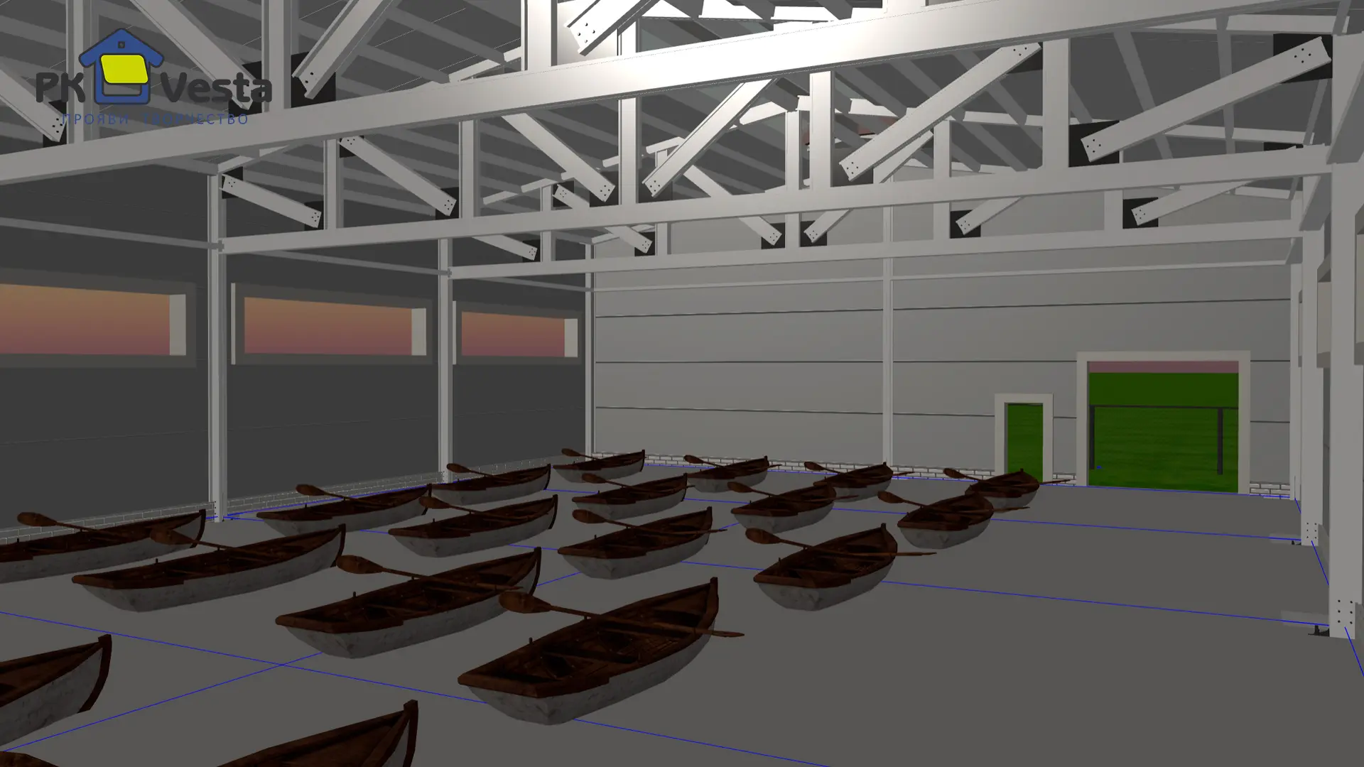 Тульский завод ПК Веста получил заказ на типовой ангар 16Ш х 26Д х 4.7В для хранения лодок на частной территории в Подмосковье. Облегченный однопролётный каркас (без несущих колонн внутри) проектируется полностью из холодногнутый оцинкованный профилей (технология ЛСТК), обеспечивая 100% защиту от коррозии. Объект находится рядом с водоемом. Внутри здания планируется применять химические абразивные вещества для мойки лодок.